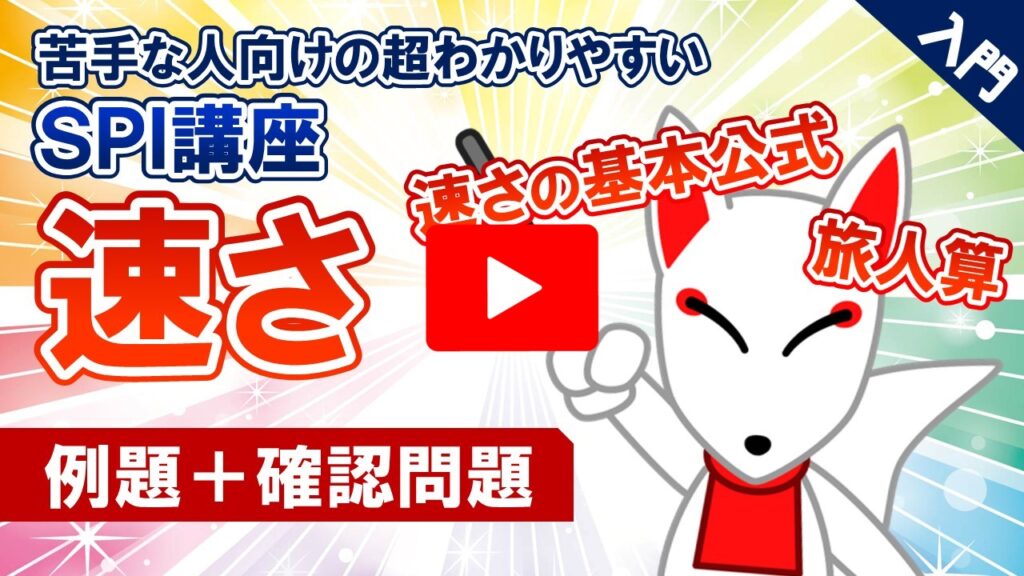 10.速さ /「動画で学ぶ!!SPI問題集」 2023.08.252023.08.31 目次 例題〔1〕、〔2〕の解説〔3〕の解説練習問題〔1〕の解説〔2〕の解説〔3〕の解説〔4〕の解説速さの単位変換50問(練習用) 例題 〔1〕、〔2〕の解説 ▶YouTubeで確認する 〔3〕の解説 ▶YouTubeで確認する 練習問題 〔1〕の解説 ▶YouTubeで確認する 〔2〕の解説 ▶YouTubeで確認する 〔3〕の解説 ▶YouTubeで確認する 〔4〕の解説 ▶YouTubeで確認する 速さの単位変換50問(練習用) おいなりさん すばやく単位変換できるように日頃から練習しておこうね‼ ▶YouTubeで確認する